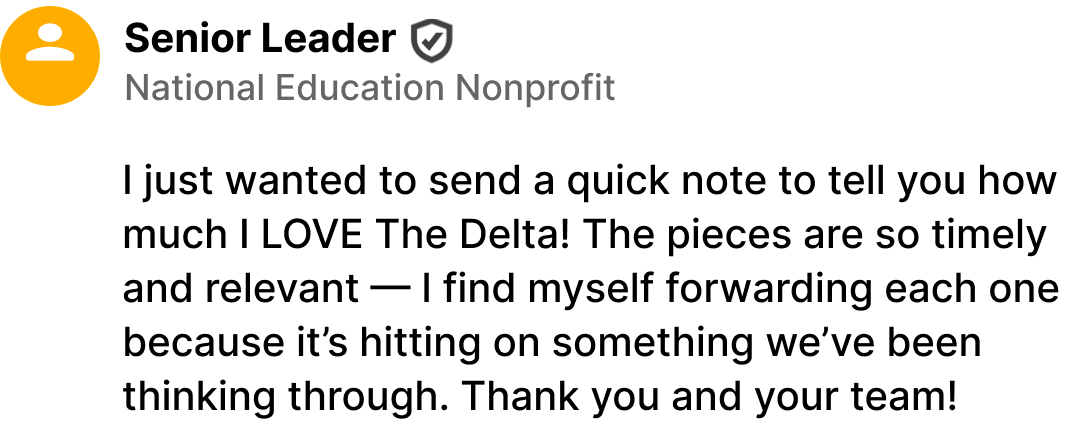 “People approach me all the time to tell me they read The Delta every week and love what we write. Chiefs and policy staff regularly reach out to say, ‘We shared this with our team,’ or ‘This helped frame our thinking.’”